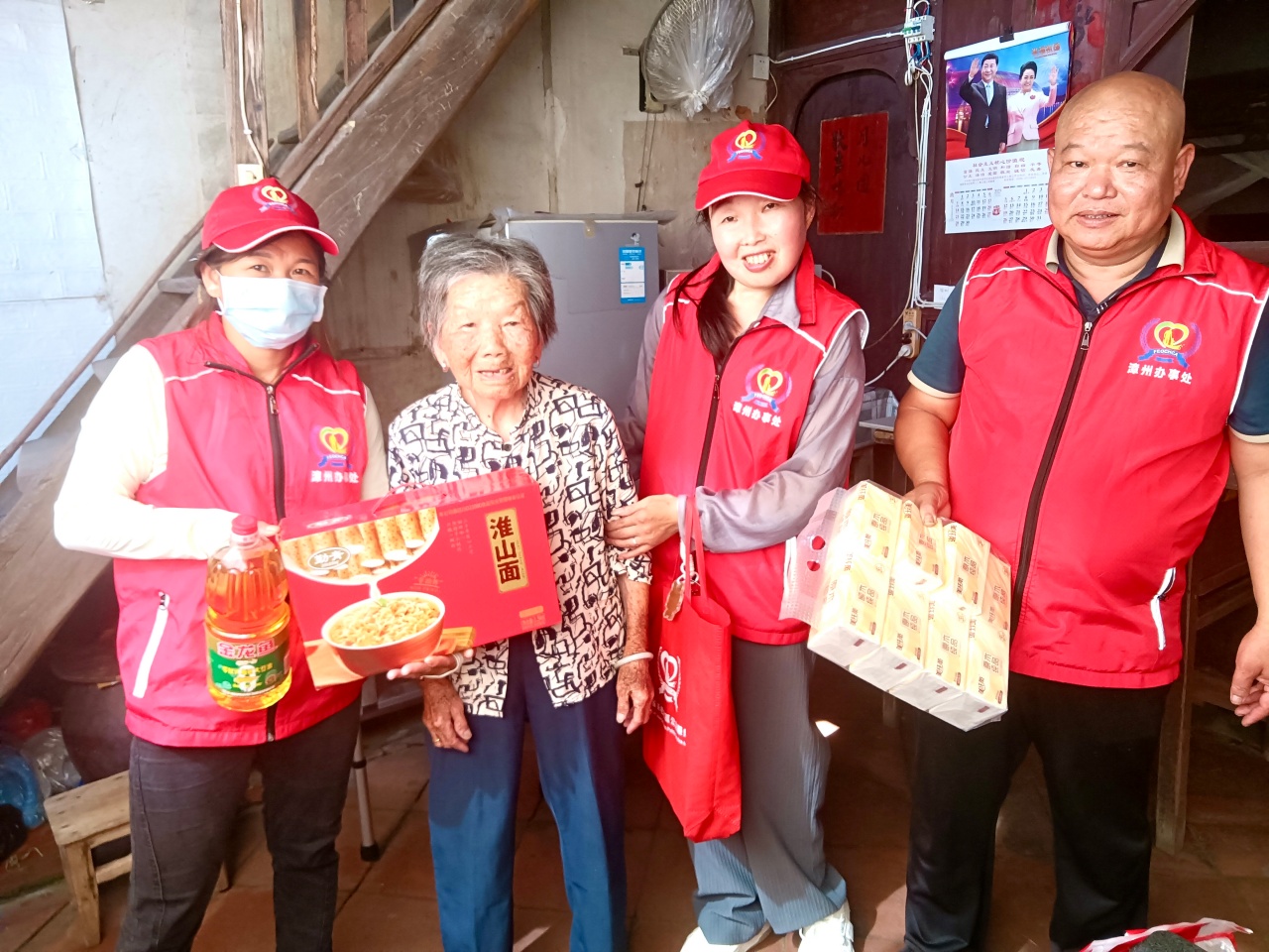 随后,志愿者们将大米、食用油、风味面制品和纸巾等生活用品送到老人手中,这些生活物资不仅解决了老人的实际需求,更传递着社会对他们的牵挂与关爱。