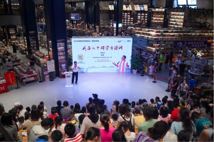 9月4日下午,由深圳市龙岗区文化广电旅游体育局主办、深圳市爱诗家文化传播有限公司承办、深圳书城龙岗城协办的“2021年龙岗少年诗词大会·诗词大讲堂‘我与儿子同学古诗词’公益文化讲座”在深圳书城龙岗城四楼活动区举行。活动还没开始,台阶上已经坐满了热爱诗词学习的家长和孩子。
